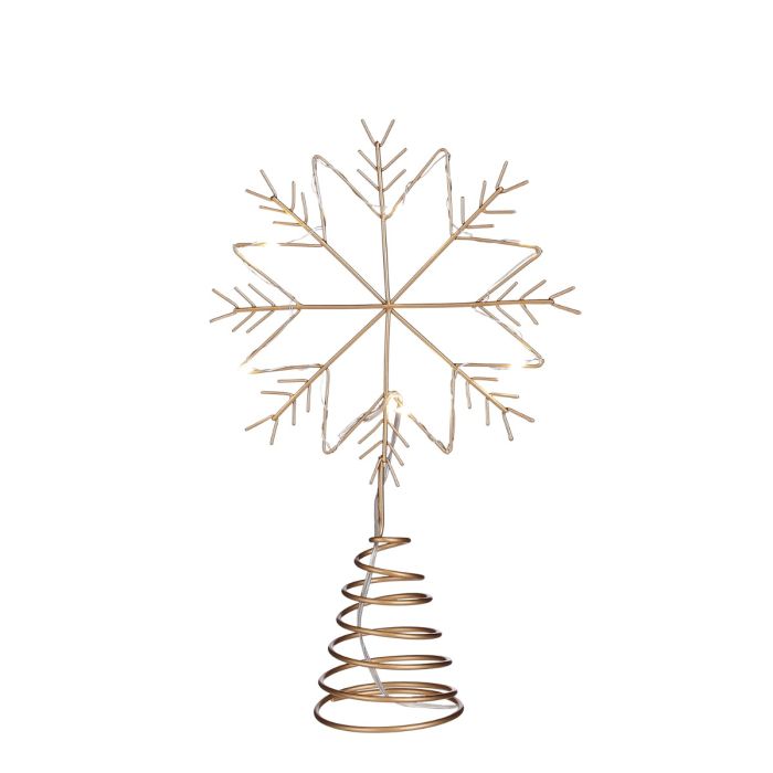 Skab en varm og strålende stemning på juletræets top med denne smukke topstjerne, der kombinerer klassisk stjerneform med et moderne snefnugsinspireret udtryk. I midten sidder en enkel stjerne, og omkring den danner fine “snefnugsarme” et elegant, luftigt omrids. Hele designet er omviklet af en tynd lyskæde, som giver en blid glød og får toppen af træet til at lyse op på en stemningsfuld måde. Topstjernen har en højde på 24 cm og en bredde på 15 cm. En harmonisk størrelse, der passer til både små og mellemstore juletræer. Den spiralformede metalfod gør det nemt at montere stjernen sikkert, så den sidder stabilt under hele julesæsonen. Den batteridrevne funktion gør det nemt at placere stjernen uden behov for ledninger, hvilket giver et rent og elegant udtryk. En moderne, lysende juletræsstjerne, der tilfører træet et magisk og hyggeligt præg.