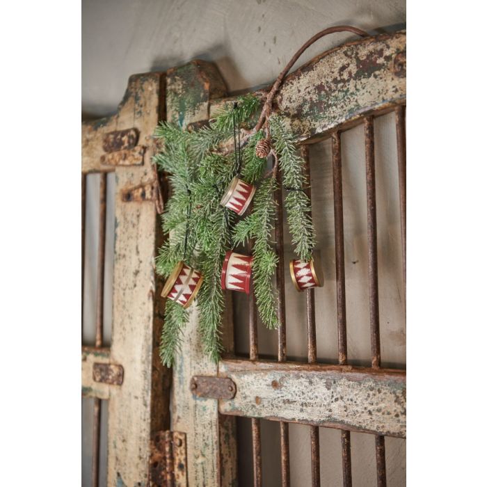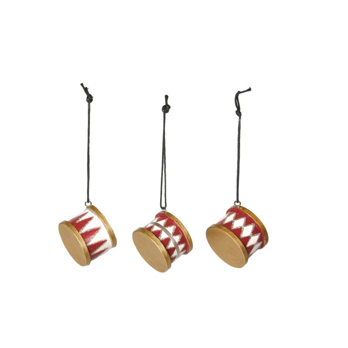 Tromme i træ med fint malet mønster i farverne rød, hvid og guld. Trommerne er til dekoration på fx grene eller på juletræet. De kan også bruges liggende som bordpynt. Trommerne er fra Speedtsbergs serie med lysestager, vaser og garder i samme farvenuancer og med samme mønstre.