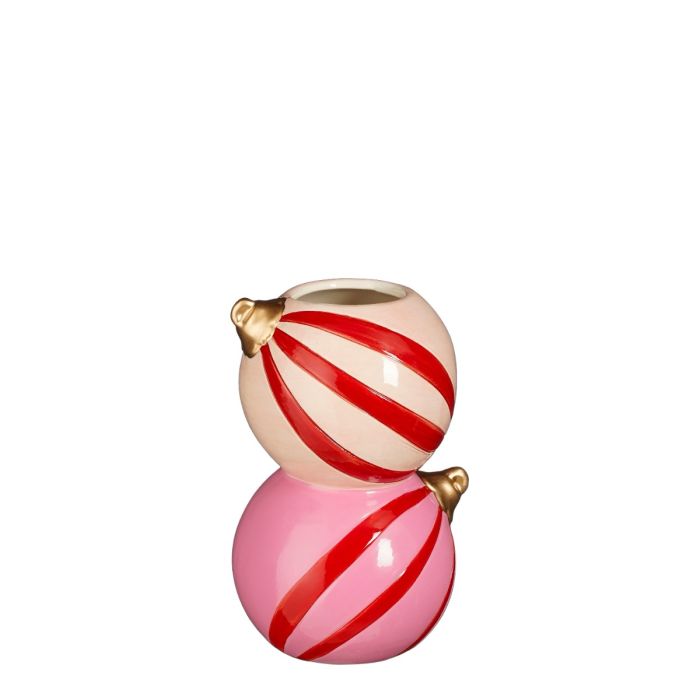 To julekugler er her stablet ovenpå hinanden til en finurlig vase. Vasen er i lyserøde nuancer med røde striber på. I samme serie fås også lysestager.