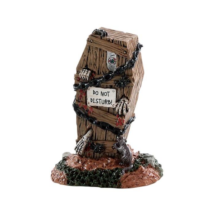 Vil ikke forstyrres. En død figur forsøger at bryde ud af sin kiste med lænker og skilt. Tilhører serien: Spooky Town.