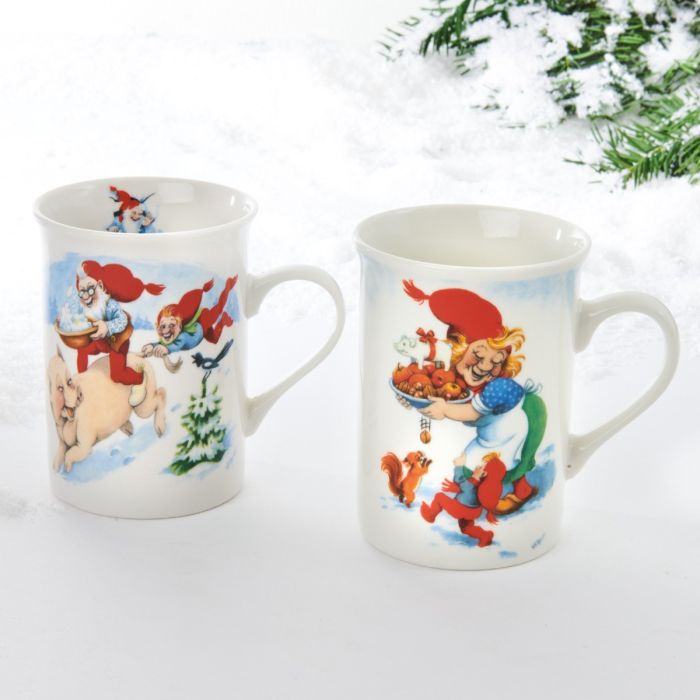Julekrus i porcelæn designet af Vilhelm Hansen. Krusenes motiver er med nissefar og gris og med nissemor med julefadet.
