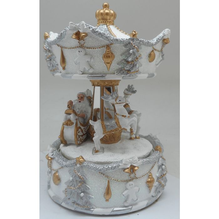 Vinterhvid karrusel. Den vinterhvide karrusel er med julemand og rensdyr. Karrusellen har mange små detaljer på både tag og sokkel. Alt er holdt i gråt, hvidt og guldfarvet. Når den mekaniske karrusel trækkes op, kan den dreje rundt og spille "Winter wonderland".