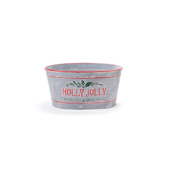 Dekorativ stor zinkbalje med påskriften: "Holly Jolly" i julefarver.
